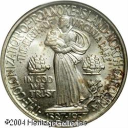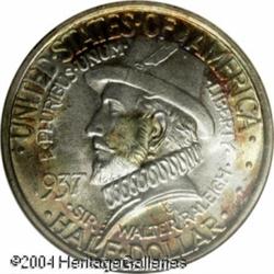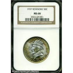 1937 50C Roanoke MS68 NGC. Vivid orange-gold and l <B>1937 50C Roanoke MS68 NGC.</B></I> Vivid orange-gold and lime-green colors outline the untoned centers, aside from a dab of sea-green color on Sir Walter Raleigh's cheek. This radiant 'tab toned' pattern is consistent with long-term storage in the commemorative holder of issue. The reverse also possesses freckles of honey, olive, and tobacco-brown patina. A boldly struck and lovingly preserved Superb Gem. Population: 18 in 68, 0 finer (11/04). <BR><BR><B>Important notice:</B> Heritage usually auctions material at the rate of 200-250 lots per hour. On some occasions eBay Live bid software or the Internet may not be able to keep up with the pace of the auction. We recommend placing a realistic absentee bid now as insurance to avoid disappointment. Occasionally the auctioneer may eliminate or reject an eBay Live bid, and the auctioneer may also reopen a lot after the close of the eBay live bidding (usually because we missed an audience bid), and may reject your bid even if it shows you as the winning bidder. By bidding via eBay Live, you agree that Heritage may award the lot to another bidder at its sole discretion under the circumstances described above or any other reasonable circumstances. Since eBay bids are not shown to us until we open the lot on the floor, we treat those bids just like floor bids. In most cases the floor responds before the eBay bid is presented to us, due to Internet lag time, so for consistency we have made it a policy that floor bids are always considered first over tie eBay live bids. Also please note that all Heritage lots purchased through eBay Live carry a 20% Buyer's Premium. Please make sure you read the Terms and Conditions before you bid. This lot is being auctioned in conjunction with a live floor auction by Heritage Galleries & Auctioneers. All final auction and invoice information will be supplied by Heritage Galleries & Auctioneers, and all other information should be considered preliminary. Lot:7940