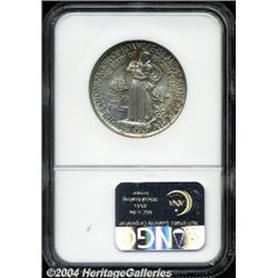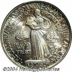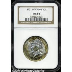 <B>1937<50C> Roanoke MS68 NGC.</B></I> Vivid orange-gold and lime-green colors outline the untoned centers, aside from a dab of sea-green color on Sir Walter Raleigh's cheek. This radiant 'tab toned' pattern is consistent with long-term storage in the commemorative holder of issue. The reverse also possesses freckles of honey, olive, and tobacco-brown patina. A boldly struck and lovingly preserved Superb Gem. Population: 17 in 68, none finer (6/04). <BR><BR><B>Important notice:</B> Heritage usually auctions material at the rate of 200-250 lots per hour. On some occasions eBay Live bid software or the Internet may not be able to keep up with the pace of the auction. We recommend placing a realistic absentee bid now as insurance to avoid disappointment. Occasionally the auctioneer may eliminate or reject an eBay Live bid, and the auctioneer may also reopen a lot after the close of the eBay live bidding (usually because we missed an audience bid), and may reject your bid even if it shows you as the winning bidder. By bidding via eBay Live, you agree that Heritage may award the lot to another bidder at its sole discretion under the circumstances described above or any other reasonable circumstances. Since eBay bids are not shown to us until we open the lot on the floor, we treat those bids just like floor bids. In most cases the floor responds before the eBay bid is presented to us, due to Internet lag time, so for consistency we have made it a policy that floor bids are always considered first over tie eBay live bids. Also please note that all Heritage lots purchased through eBay Live carry a 20% Buyer's Premium. Please make sure you read the Terms and Conditions before you bid. </span></font></tr></table></td></tr></table>