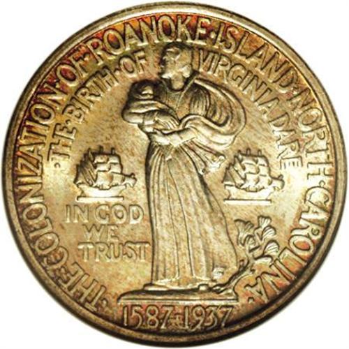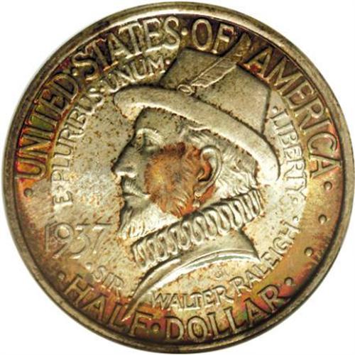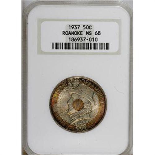<B>1937 50C Roanoke MS68 NGC.</B></I> An amazing, original tab toned specimen, the obverse has a ring and tabs of lighter silver color where it was protected from the actual tabs on the original toning, and deep iridescent toning in the exposed areas, matching the reverse display. An amazing piece that is tied for the best ever certified. Census: 23 in 68, 0 finer (8/07).<BR><BR><b>Shipping:</b> Coins & Currency (<a target="_blank" href="http://www.heritageauctions.com/common/shipping.php">view shipping information</a>)