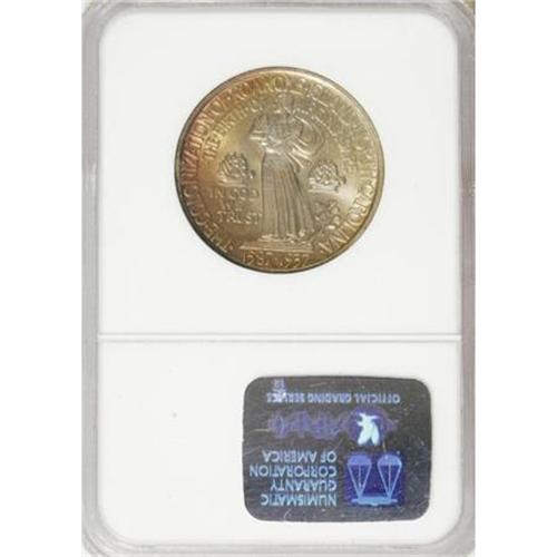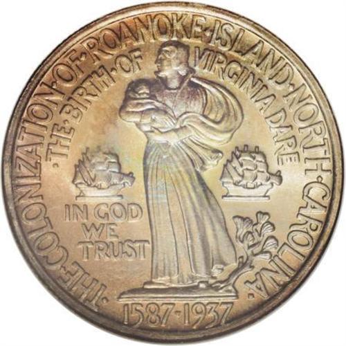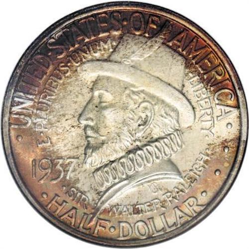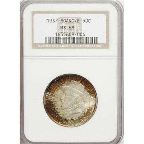 <B>1937 50C Roanoke MS68 NGC.</B></I> On this wonderful piece, rich crimson-russet tab toning surrounds a softer cloud-gray center on the obverse. The reverse displays colorful swirls of crimson, orange-tan, and olive-copper over the crisply defined surfaces. A wonderful example of this one-issue design from the waning years of the classic commemorative series. Census: 16 in 68, 7 in 68 <img src="/images/star.gif" width="10" height="10" alt="" border="0">, 0 finer (11/07).<BR><BR><b>Shipping:</b> Coins & Currency (<a target="_blank" href="http://www.heritageauctions.com/common/shipping.php">view shipping information</a>)