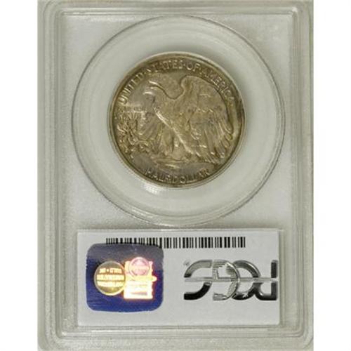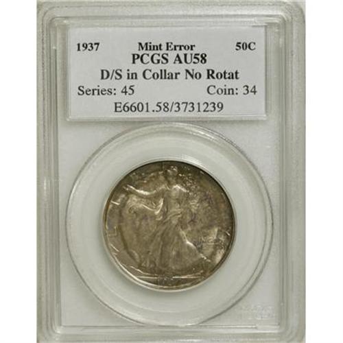 <B>1937 50C Walking Liberty Half--Struck Twice in Collar, No Rotation--AU58 PCGS.</B></I> Richly toned violet and russet-gray with only a hint of friction. This strongly lustrous piece shows a slight shift at the rims, indicative of multiple strikes within the collar, and while the central devices show no doubling, the atypically bold strike is suggestive.<BR><BR><B>Coin Engraver:</B> Adolph A. Weinman<BR><BR><b>Shipping:</b> Coins & Currency (<a target="_blank" href="http://www.heritageauctions.com/common/shipping.php">view shipping information</a>)