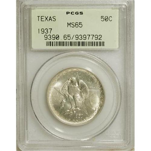 <B>1937 50C Texas MS65 PCGS.</B></I> PCGS Population (593/370). NGC Census: (405/387). Mintage: 6,571. Numismedia Wsl. Price for NGC/PCGS coin in MS65: $292. (#9390)<BR><BR><b>Shipping:</b> Coins & Currency (<a target="_blank" href="http://www.heritageauctions.com/common/shipping.php">view shipping information</a>)
