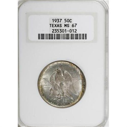 <B>1937 50C Texas MS67 NGC.</B></I> Lilac, honey-gold, and lime patina invigorates this lustrous and gorgeously preserved Superb Gem. A good strike with any incompleteness limited to the knee of the Winged Victory. Encased in a prior generation holder.<BR><I>From The Silver Spur Collection.</B></I><BR><BR><b>Shipping:</b> Coins & Currency (<a target="_blank" href="http://www.heritageauctions.com/common/shipping.php">view shipping information</a>)