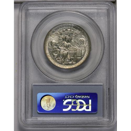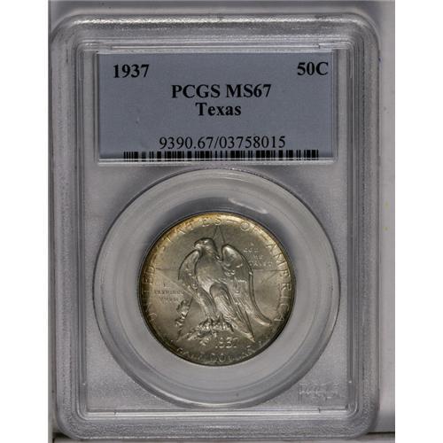 <B>1937<50C> Texas MS67 PCGS.</B></I> Bright lime-green, gold, and crimson iridescence occurs near some of the obverse and reverse borders. The striking details are full and crisp and the coin's surface preservation is outstanding. A faint scrape, along the bottoms of RIC, is too slight to limit the grade. Population: 70 in 67, 2 finer (5/06).