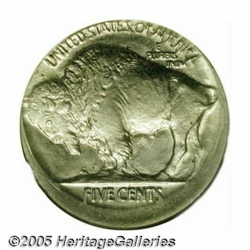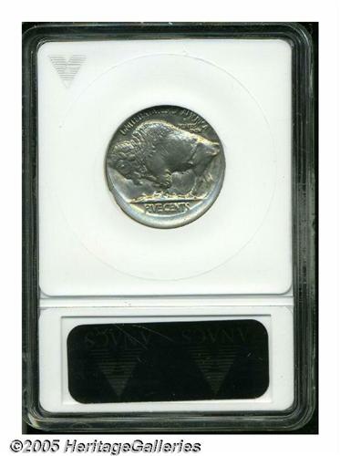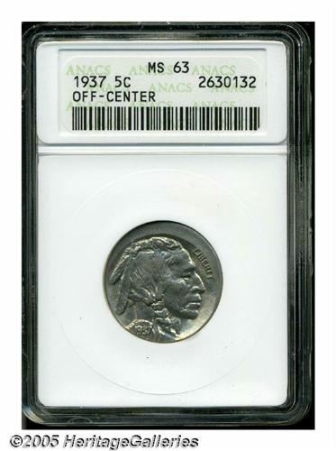 <B>1937<5C Error> Buffalo Nickel--Struck Off-Center--MS63 ANACS.</B></I> The piece is struck off-center by approximately twenty percent (see photo image.) Sharply struck and lustrous, with untoned, unabraded surfaces that show a few scattered flyspecks on the reverse.