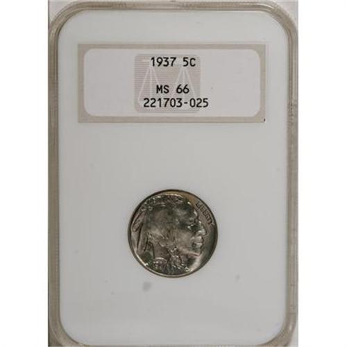 <B>1937 5C MS66 NGC.</B></I> . NGC Census: (3775/323). PCGS Population (2974/269). Mintage: 79,485,768. Numismedia Wsl. Price for NGC/PCGS coin in MS66: $88. (#3980)<BR><BR><B>Coin Engraver:</B> James E. Fraser<BR><BR><b>Shipping:</b> Coins & Currency (<a target="_blank" href="http://www.heritageauctions.com/common/shipping.php">view shipping information</a>)