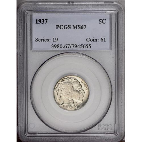 <B>1937<5C> MS67 NGC.</B></I> Lightly toned surfaces radiate intense luster, and are devoid of mentionable marks. The design features are well brought up. Only four coins have been certified finer by PCGS (1/06).