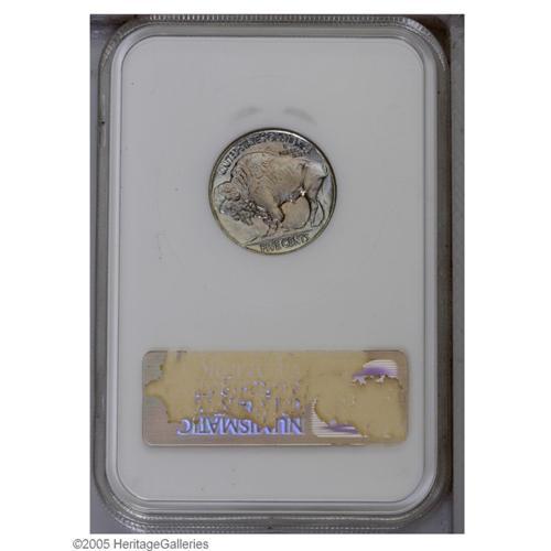 <B>1937<5C> MS67 NGC.</B></I> This pretty Buffalo nickel displays champagne centers and sky-blue borders. The design elements are sharply struck, and the lustrous surfaces are essentially free of mentionable marks. A truly superb coin. NGC has certified a mere 2 pieces finer, and PCGS has seen only 4 coins grading higher (9/05).