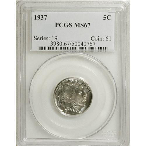 <B>1937 5C MS67 PCGS.</B></I> PCGS Population (246/4). NGC Census: (632/8). Mintage: 79,485,768. Numismedia Wsl. Price for NGC/PCGS coin in MS67: $380. (#3980)<BR><BR><b>Shipping:</b> Coins & Currency (<a target="_blank" href="http://www.heritageauctions.com/common/shipping.php">view shipping information</a>)