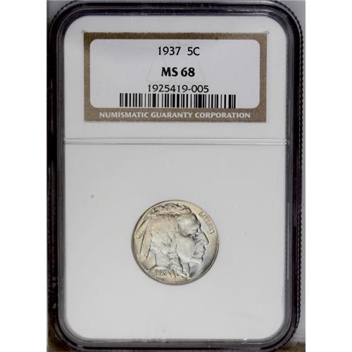 <B>1937<5C> MS68 NGC.</B></I> As befits the high mintage of 79.485 million pieces, th is is one of the most common dates in the series, with examples being readily available in all grades. Nearly 12,000 specimens have been certified by NGC and PCGS in MS65 and MS66, and a little over 500 in MS67. In the lofty grade of MS68, however, a mere six coins have been graded, and none finer (3/06). This specimen displays delicate iridescent ice-blue, gold-beige, and lilac patina over near-pristine surfaces that exhibit dazzling luster. The design features are well executed throughout. <BR><BR><B>Important notice:</B> Heritage usually auctions material at the rate of 200-250 lots per hour. On some occasions eBay Live bid software or the Internet may not be able to keep up with the pace of the auction. We recommend placing a realistic absentee bid now as insurance to avoid disappointment. Occasionally the auctioneer may eliminate or reject an eBay Live bid, and the auctioneer may also reopen a lot after the close of the eBay live bidding (usually because we missed an audience bid), and may reject your bid even if it shows you as the winning bidder. By bidding via eBay Live, you agree that Heritage may award the lot to another bidder at its sole discretion under the circumstances described above or any other reasonable circumstances. Since eBay bids are not shown to us until we open the lot on the floor, we treat those bids just like floor bids. In most cases the floor responds before the eBay bid is presented to us, due to Internet lag time, so for consistency we have made it a policy that floor bids are always considered first over tie eBay live bids. Also please note that all Heritage lots purchased through eBay Live carry a 20% Buyer's Premium. Please make sure you read the Terms and Conditions before you bid. This lot is being auctioned in conjunction with a live floor auction by Heritage Galleries & Auctioneers. All final auction and invoice information will be supplied by Heritage Galleries & Auctioneers, and all other information should be considered preliminary. Lot:1127 <BR><BR><B>Winning Notification and Billing:</B> After the FINAL session in this auction is complete, Heritage will send e-mail and snail mail invoices. This process normally takes several days. All final auction and invoice information will be supplied by Heritage Galleries & Auctioneers, and all other information should be considered preliminary. <BR><BR>This auction will be conducted on a live auction floor and over the Internet through eBay Live. If you choose to place an absentee bid, please take a moment to <font color='#0000ff'><u><a href='http://pages.ebay.com/liveauctions/help/before/laabsentee.html'>learn how eBay Live absentee bidding works</a></u></font><font color='#000000'>