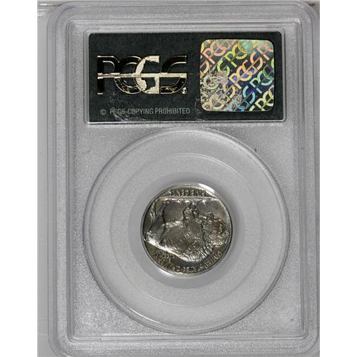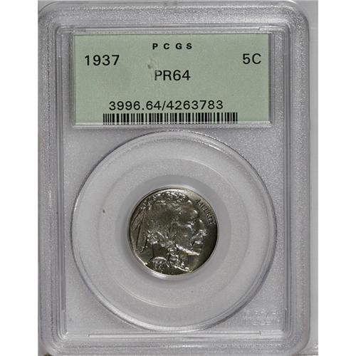 <B>1937<5C> PR64 PCGS.</B></I> An interesting, moderately mirrored example of this Buffalo nickel. The surfaces, toned light blue and champagne, are peppered on both sides with tiny spots of dark toning. Faint hairlines near the Indian's cheek preclude Gem status.<BR><I>From The Carolina Gold Collection, Part Four.</B></I>