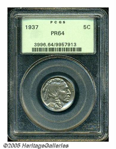 <B>1937<5C> PR64 PCGS.</B></I> Bright proof surfaces display light gold-tan obverse patina, which is joined by faded crimson on the reverse. The obverse is also visited by tiny charcoal specks. The design elements are exquisitely struck, and the surfaces are seemingly devoid of significant abrasions.