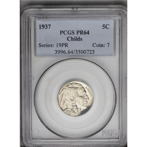 <B>1937<5C> PR64 PCGS.</B></I> Ex: Childs. This needle-sharp and untoned near-Gem is only limited in grade by distributed tiny carbon flecks. The Childs Collection is famous for its PR68 Sultan of Muscat 1804 dollar.<BR><I>Ex: Walter H. Childs Collection (Bowers and Merena, 8/99), lot 148.</B></I>