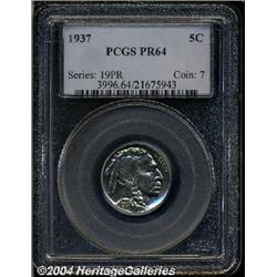 <B>1937<5C> PR64 PCGS.</B></I> This brilliant proof reveals a blush of pale blue on the Indian's head, and a splash of multicolored toning on the bison's shoulder area. Sharply struck, with no mentionable marks. <BR><BR><B>Important notice:</B> Heritage usually auctions material at the rate of 200-250 lots per hour. On some occasions eBay Live bid software or the Internet may not be able to keep up with the pace of the auction. We recommend placing a realistic absentee bid now as insurance to avoid disappointment. Occasionally the auctioneer may eliminate or reject an eBay Live bid, and the auctioneer may also reopen a lot after the close of the eBay live bidding (usually because we missed an audience bid), and may reject your bid even if it shows you as the winning bidder. By bidding via eBay Live, you agree that Heritage may award the lot to another bidder at its sole discretion under the circumstances described above or any other reasonable circumstances. Since eBay bids are not shown to us until we open the lot on the floor, we treat those bids just like floor bids. In most cases the floor responds before the eBay bid is presented to us, due to Internet lag time, so for consistency we have made it a policy that floor bids are always considered first over tie eBay live bids. Also please note that all Heritage lots purchased through eBay Live carry a 20% Buyer's Premium. Please make sure you read the Terms and Conditions before you bid.
