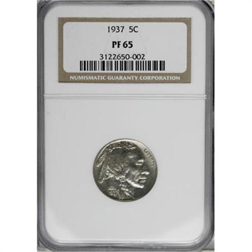<B>1937 5C PR65 NGC.</B></I> A gleaming Gem exemplar from the last proof Buffalo nickel issue, decisively struck with whispers of gold-green that grace the slightly hazy nickel-gray surfaces. Carefully preserved and delightful.<BR><BR><b>Shipping:</b> Coins & Currency (<a target="_blank" href="http://www.heritageauctions.com/common/shipping.php">view shipping information</a>)