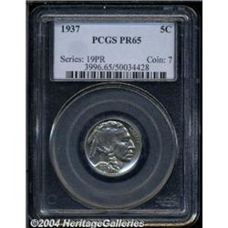 <B>1937<5C> PR65 PCGS.</B></I> A thin film of light-gold color does not hide the brilliance emanating from the exquisitely-preserved surfaces of this gorgeous proof Buffalo nickel. A toning spot is concealed on the Indian's jaw near the braid, and is mentioned for accuracy. <BR><BR><B>Important notice:</B> Heritage usually auctions material at the rate of 200-250 lots per hour. On some occasions eBay Live bid software or the Internet may not be able to keep up with the pace of the auction. We recommend placing a realistic absentee bid now as insurance to avoid disappointment. Occasionally the auctioneer may eliminate or reject an eBay Live bid, and the auctioneer may also reopen a lot after the close of the eBay live bidding (usually because we missed an audience bid), and may reject your bid even if it shows you as the winning bidder. By bidding via eBay Live, you agree that Heritage may award the lot to another bidder at its sole discretion under the circumstances described above or any other reasonable circumstances. Since eBay bids are not shown to us until we open the lot on the floor, we treat those bids just like floor bids. In most cases the floor responds before the eBay bid is presented to us, due to Internet lag time, so for consistency we have made it a policy that floor bids are always considered first over tie eBay live bids. Also please note that all Heritage lots purchased through eBay Live carry a 20% Buyer's Premium. Please make sure you read the Terms and Conditions before you bid.