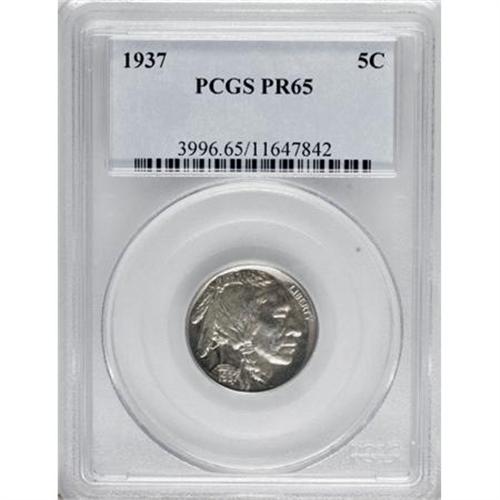 <B>1937 5C PR65 PCGS.</B></I> This exquisite Gem possesses an exacting strike, and the glassy almond-gold fields are void of hairlines and offer only trivial carbon. The end of the trail for the proof Buffalo nickel, although the designs were resurrected for NCLT issues within recent years.<BR><BR><b>Shipping:</b> Coins & Currency (<a target="_blank" href="http://www.heritageauctions.com/common/shipping.php">view shipping information</a>)