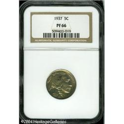 1937 5C PR66 NGC. Sharply struck, with touches of <B>1937 5C PR66 NGC.</B></I> Sharply struck, with touches of faint speckled olive and rose color over bright proof surfaces that are devoid of significant abrasions. <BR><BR><B>Important notice:</B> Heritage usually auctions material at the rate of 200-250 lots per hour. On some occasions eBay Live bid software or the Internet may not be able to keep up with the pace of the auction. We recommend placing a realistic absentee bid now as insurance to avoid disappointment. Occasionally the auctioneer may eliminate or reject an eBay Live bid, and the auctioneer may also reopen a lot after the close of the eBay live bidding (usually because we missed an audience bid), and may reject your bid even if it shows you as the winning bidder. By bidding via eBay Live, you agree that Heritage may award the lot to another bidder at its sole discretion under the circumstances described above or any other reasonable circumstances. Since eBay bids are not shown to us until we open the lot on the floor, we treat those bids just like floor bids. In most cases the floor responds before the eBay bid is presented to us, due to Internet lag time, so for consistency we have made it a policy that floor bids are always considered first over tie eBay live bids. Also please note that all Heritage lots purchased through eBay Live carry a 20% Buyer's Premium. Please make sure you read the Terms and Conditions before you bid. This lot is being auctioned in conjunction with a live floor auction by Heritage Galleries & Auctioneers. All final auction and invoice information will be supplied by Heritage Galleries & Auctioneers, and all other information should be considered preliminary. Lot:5626