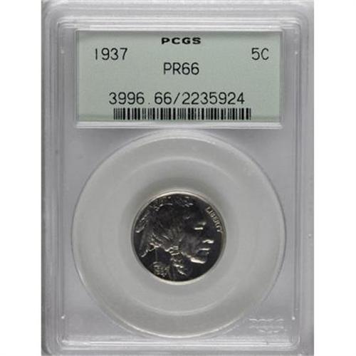 <B>1937 5C PR66 PCGS.</B></I> Wisps of lilac and green-gold toning envelop this virtually immaculate final-year proof Buffalo nickel. The strike is sharp despite a whisper of incompleteness above the braid. Encapsulated in an old green label holder.<BR><BR><b>Shipping:</b> Coins & Currency (<a target="_blank" href="http://www.heritageauctions.com/common/shipping.php">view shipping information</a>)