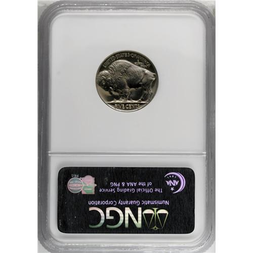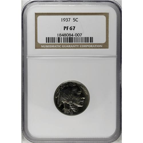 <B>1937<5C> PR67 NGC.</B></I> Pastel apricot and steel-blue embrace this nicely struck and gorgeously preserved Superb Gem. Lengthy evaluation beneath a loupe locates only a minuscule carbon fleck near 9 o'clock. Although the Denver Mint coined Buffalo nickels in 1938, 1937 was the final year for proof production of the type.<BR><I>From The Redfjord Collection.</B></I>