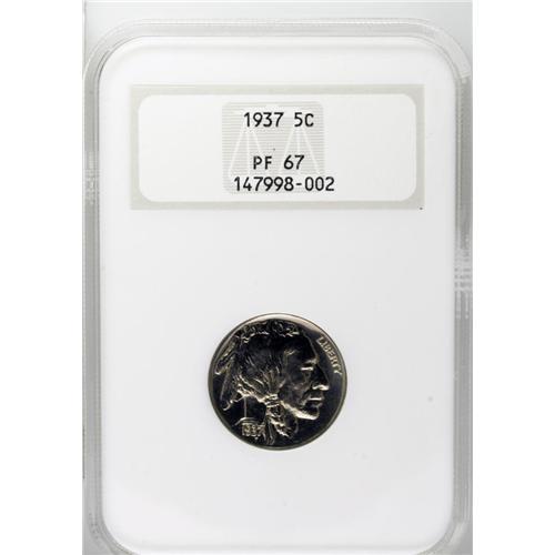 <B>1937 5C PR67 NGC.</B></I> This Brilliant finish proof Superb Gem has flashy mirrored fields and a hint of gold toning. Rose-pink shades also emerge near the bison's head. Sharply struck and undisturbed. No proof Buffalo nickels were struck in 1938, although the series was struck in Denver as a business strike that year. Certified in an older NGC holder.<BR><I>From The James Paul Collection.</B></I><BR><BR><b>Shipping:</b> Coin/Currency (<a target="_blank" href="http://www.heritageauctions.com/common/shipping.php">view shipping information</a>)