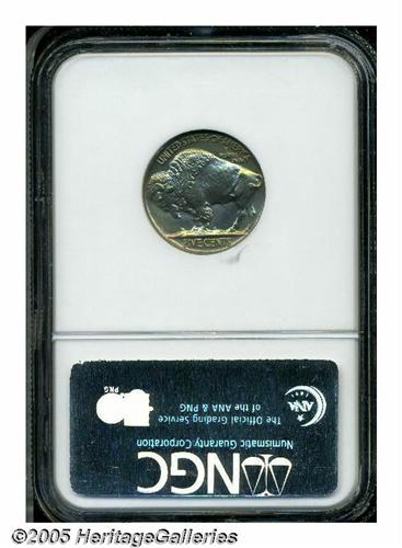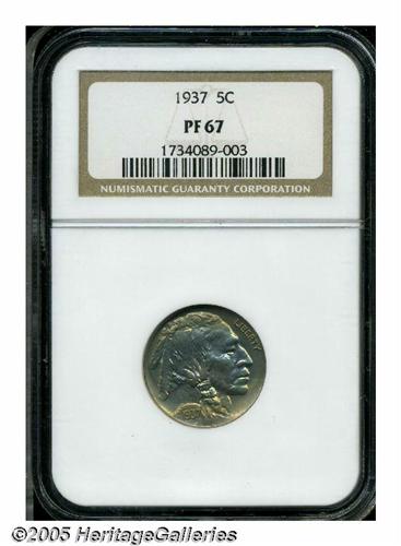 <B>1937<5C> PR67 NGC.</B></I> This Superb Gem quality proof Buffalo has extremely deep mirrored fields with subtle green color over each side. The border areas are also decorated with rich antique-gold and crimson colorations. A pristine specimen.