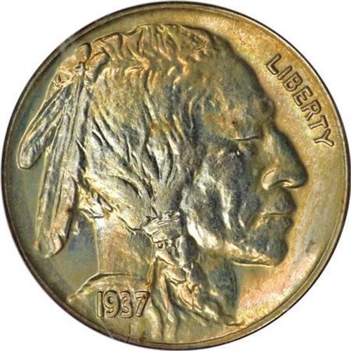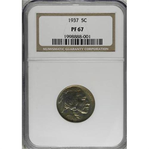 <B>1937 5C PR67 NGC.</B></I> Delightful multicolored toning appears on each side of this razor-sharp Superb Gem. The fields are highly reflective, though both sides display slight milkiness as well. A great example of this popular nickel, one of just 5,769 specimens coined for the last proof issue of its kind. NGC has graded 34 pieces finer (4/07).<BR><BR><b>Shipping:</b> Coins & Currency (<a target="_blank" href="http://www.heritageauctions.com/common/shipping.php">view shipping information</a>\)