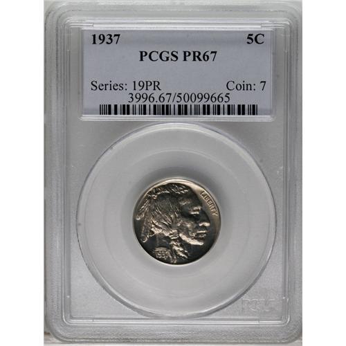 <B>1937 5C PR67 PCGS.</B></I> A thin veneer of champagne-gold color coats brilliant, well cared-for surfaces that are devoid of any mentionable marks. All of the design elements are well brought up. While this issue is the most readily available of proof Buffalo nickels, a number of pieces have been impaired, making this Superb example an excellent choice.<BR><BR><b>Shipping:</b> Coins & Currency (<a target="_blank" href="http://www.heritageauctions.com/common/shipping.php">view shipping information</a>)