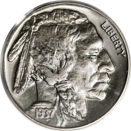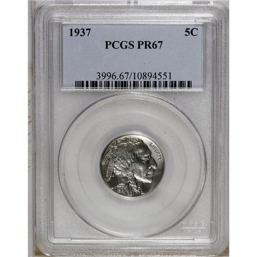 <B>1937 5C PR67 PCGS.</B></I> Pastel sky-blue, lilac, and chestnut patina graces this nicely mirrored Superb Gem. The strike is only incomplete above the Indian's braid. Devoid of mentionable marks, and a beautiful representative of the type. With its 5,769-piece mintage, this is the most readily available of proof Buffalo nickels.<BR><BR><b>Shipping:</b> Coins & Currency (<a target="_blank" href="http://www.heritageauctions.com/common/shipping.php">view shipping information</a>)