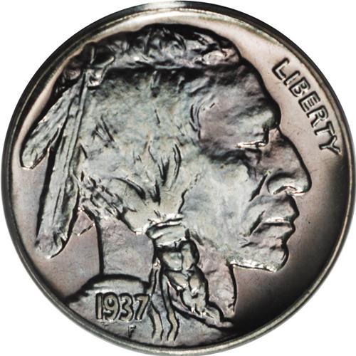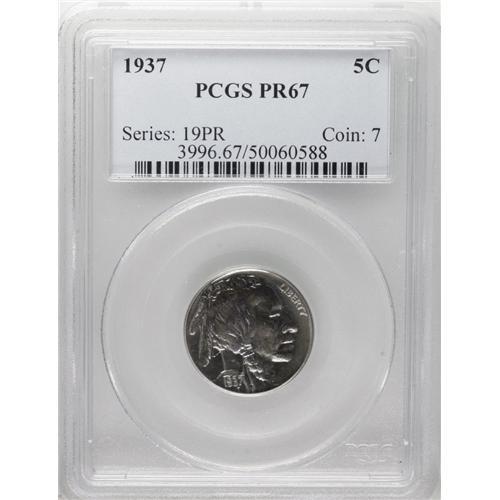 <B>1937 5C PR67 PCGS.</B></I> The gleaming silver-blue surfaces of this Superb Gem have a hint of greenish haze at the periphery. Moderate reflectivity only enhances the eye appeal, and a small carbon spot between the bison's rear legs is a minor flaw at worst. This issue is popular among collectors as the most available brilliant proof of the series.<BR><BR><b>Shipping:</b> Coin/Currency (<a target="_blank" href="http://www.heritageauctions.com/common/shipping.php">view shipping information</a>)