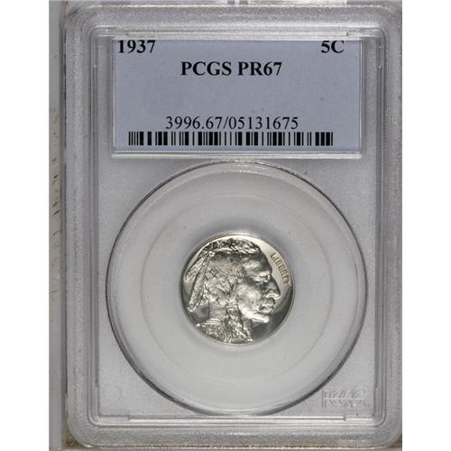 <B>1937<5C> PR67 PCGS.</B></I> This magnificent Superb Gem specimen is so highly reflective that it almost appears to be made of glass. The design elements are fully brought up by a powerful striking impression, and the essentially untoned surfaces are pristine. A great example of this final Buffalo nickel proof issue.