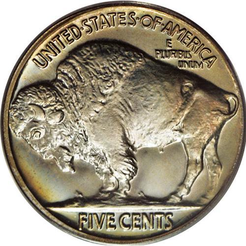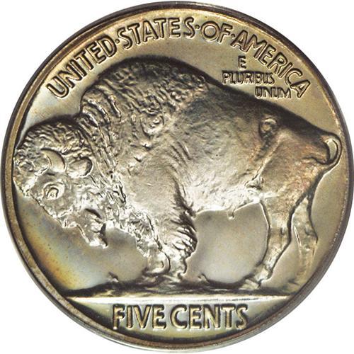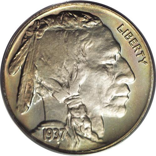 <B>1937<5C> PR67 PCGS.</B></I> With a mintage of 5,769 pieces, the 1937 is the most readily available of proof Buffalo nickels, though a number of them have been impaired. The current example is truly superb in all aspects. The underlying brilliance, especially that in the fields, cuts through the overlying film of gorgeous iridescent rainbow-like patina, and the striking impressions are powerful throughout. Close scrutiny reveals no significant contact marks or hairlines.