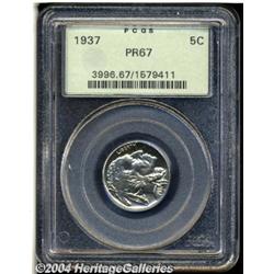 <B>1937<5C> PR67 PCGS.</B></I> Brilliant throughout with deeply reflective mirrors on each side and surfaces that are essentially perfect in terms of their overall preservation. A flashy and immediately attractive proof striking. <BR><BR><B>Important notice:</B> Heritage usually auctions material at the rate of 200-250 lots per hour. On some occasions eBay Live bid software or the Internet may not be able to keep up with the pace of the auction. We recommend placing a realistic absentee bid now as insurance to avoid disappointment. Occasionally the auctioneer may eliminate or reject an eBay Live bid, and the auctioneer may also reopen a lot after the close of the eBay live bidding (usually because we missed an audience bid), and may reject your bid even if it shows you as the winning bidder. By bidding via eBay Live, you agree that Heritage may award the lot to another bidder at its sole discretion under the circumstances described above or any other reasonable circumstances. Since eBay bids are not shown to us until we open the lot on the floor, we treat those bids just like floor bids. In most cases the floor responds before the eBay bid is presented to us, due to Internet lag time, so for consistency we have made it a policy that floor bids are always considered first over tie eBay live bids. Also please note that all Heritage lots purchased through eBay Live carry a 20% Buyer's Premium. Please make sure you read the Terms and Conditions before you bid.