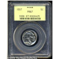 <B>1937<5C> PR67 PCGS.</B></I> Uncommonly deep mirrors and surfaces that are void of most tiny imperfections. A dazzling, top quality proof Buffalo. Population: 324 in 67, 10 finer (3/04). <BR><BR><B>Important notice:</B> Heritage usually auctions material at the rate of 200-250 lots per hour. On some occasions eBay Live bid software or the Internet may not be able to keep up with the pace of the auction. We recommend placing a realistic absentee bid now as insurance to avoid disappointment. Occasionally the auctioneer may eliminate or reject an eBay Live bid, and the auctioneer may also reopen a lot after the close of the eBay live bidding (usually because we missed an audience bid), and may reject your bid even if it shows you as the winning bidder. By bidding via eBay Live, you agree that Heritage may award the lot to another bidder at its sole discretion under the circumstances described above or any other reasonable circumstances. Since eBay bids are not shown to us until we open the lot on the floor, we treat those bids just like floor bids. In most cases the floor responds before the eBay bid is presented to us, due to Internet lag time, so for consistency we have made it a policy that floor bids are always considered first over tie eBay live bids. Also please note that all Heritage lots purchased through eBay Live carry a 20% Buyer's Premium. Please make sure you read the Terms and Conditions before you bid.