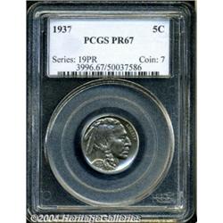 <B>1937<5C> PR67 PCGS.</B></I> Brilliant in finish, as are all proof Buffalo Nickels of this date, this coin possesses glassy fields that form a splendid backdrop to the fully brought up devices. There is some golden and powder-blue toning on either side, and both sides are also free of mentionable blemishes. A final-year proof issue that would fit nicely into a Superb quality type set. <BR><BR><B>Important notice:</B> Heritage usually auctions material at the rate of 200-250 lots per hour. On some occasions eBay Live bid software or the Internet may not be able to keep up with the pace of the auction. We recommend placing a realistic absentee bid now as insurance to avoid disappointment. Occasionally the auctioneer may eliminate or reject an eBay Live bid, and the auctioneer may also reopen a lot after the close of the eBay live bidding (usually because we missed an audience bid), and may reject your bid even if it shows you as the winning bidder. By bidding via eBay Live, you agree that Heritage may award the lot to another bidder at its sole discretion under the circumstances described above or any other reasonable circumstances. Since eBay bids are not shown to us until we open the lot on the floor, we treat those bids just like floor bids. In most cases the floor responds before the eBay bid is presented to us, due to Internet lag time, so for consistency we have made it a policy that floor bids are always considered first over tie eBay live bids. Also please note that all Heritage lots purchased through eBay Live carry a 20% Buyer's Premium. Please make sure you read the Terms and Conditions before you bid. </span></font></tr></table></td></tr></table>
