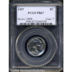 <B>1937<5C> PR67 PCGS.</B></I> A stunning proof Buffalo whose fields shimmer with a brightly reflective, mirrored finish. The surfaces appear to be flawless. Both sides initially present as brilliant, however, a little pale golden color is seen on each side as the coin is turned under a light. Superb and almost unimprovable. <BR><BR><B>Important notice:</B> Heritage usually auctions material at the rate of 200-250 lots per hour. On some occasions eBay Live bid software or the Internet may not be able to keep up with the pace of the auction. We recommend placing a realistic absentee bid now as insurance to avoid disappointment. Occasionally the auctioneer may eliminate or reject an eBay Live bid, and the auctioneer may also reopen a lot after the close of the eBay live bidding (usually because we missed an audience bid), and may reject your bid even if it shows you as the winning bidder. By bidding via eBay Live, you agree that Heritage may award the lot to another bidder at its sole discretion under the circumstances described above or any other reasonable circumstances. Since eBay bids are not shown to us until we open the lot on the floor, we treat those bids just like floor bids. In most cases the floor responds before the eBay bid is presented to us, due to Internet lag time, so for consistency we have made it a policy that floor bids are always considered first over tie eBay live bids. Also please note that all Heritage lots purchased through eBay Live carry a 20% Buyer's Premium. Please make sure you read the Terms and Conditions before you bid. </span></font></tr></table></td></tr></table>