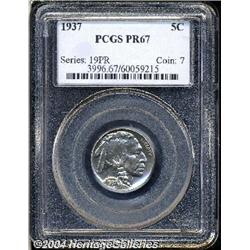 <B>1937<5C> PR67 PCGS.</B></I> Uniformly brilliant in finish, the golden tinged surfaces are devoid of bothersome hairlines and contact marks. This is a perfect coin to represent the Buffalo Nickel in a high grade proof type set. <BR><BR><B>Important notice:</B> Heritage usually auctions material at the rate of 200-250 lots per hour. On some occasions eBay Live bid software or the Internet may not be able to keep up with the pace of the auction. We recommend placing a realistic absentee bid now as insurance to avoid disappointment. Occasionally the auctioneer may eliminate or reject an eBay Live bid, and the auctioneer may also reopen a lot after the close of the eBay live bidding (usually because we missed an audience bid), and may reject your bid even if it shows you as the winning bidder. By bidding via eBay Live, you agree that Heritage may award the lot to another bidder at its sole discretion under the circumstances described above or any other reasonable circumstances. Since eBay bids are not shown to us until we open the lot on the floor, we treat those bids just like floor bids. In most cases the floor responds before the eBay bid is presented to us, due to Internet lag time, so for consistency we have made it a policy that floor bids are always considered first over tie eBay live bids. Also please note that all Heritage lots purchased through eBay Live carry a 20% Buyer's Premium. Please make sure you read the Terms and Conditions before you bid.