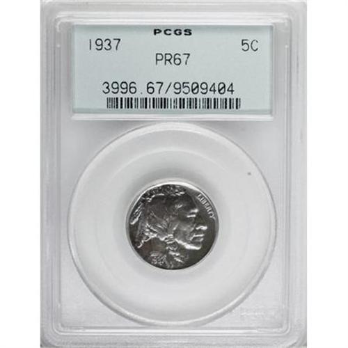 <B>1937 5C PR67 PCGS.</B></I> The 1937 proof five cent, with a mintage of 5,769 pieces, is according to David Lange <I>(The Complete Guide to Buffalo Nickels),</B></I> "... the most readily available of proof Buffalo nickels. Though a number of pieces have been impaired, even gems turn up with some frequency." A thin veneer of iridescent ice-blue, beige-gold, and lilac patina covers well preserved surfaces of this Superb Gem. Exquisite definition is noted on all of the design features. Housed in a green-label holder.<BR><BR><b>Shipping:</b> Coins & Currency (<a target="_blank" href="http://www.heritageauctions.com/common/shipping.php">view shipping information</a>)