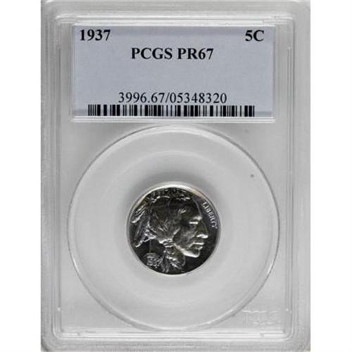 <B>1937 5C PR67 PCGS.</B></I> A thin coat of powder-blue, beige-gold, and lilac patina runs over the reflective surfaces of this gorgeous Superb Gem proof Buffalo nickel. Impeccably preserved, with an attentive strike that brings out great detail on the design elements. David Lange (2000) writes of the 1937 proof: "While its mintage is minuscule by the standards of recent decades, this is the most readily available of proof Buffalo nickels."<BR><BR><b>Shipping:</b> Coins & Currency (<a target="_blank" href="http://www.heritageauctions.com/common/shipping.php">view shipping information</a>\)