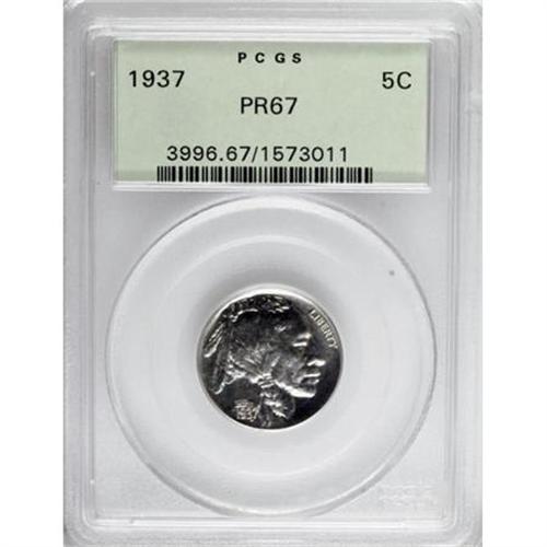 <B>1937 5C PR67 PCGS.</B></I> A near-pristine Superb Gem, with dark deep-mirror fields and exquisitely detailed design elements. A tiny nick just above the Indian's ear is the only minor annoyance. Definitely a no-contrast proof but highly attractive nonetheless, and encapsulated in an older-style PCGS holder with a light-green label. The reverse die is rotated about 25 degrees counterclockwise. <BR><BR><b>Shipping:</b> Coins & Currency (<a target="_blank" href="http://www.heritageauctions.com/common/shipping.php">view shipping information</a>\)