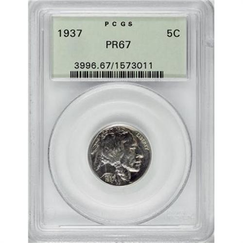 <B>1937 5C PR67 PCGS.</B></I> A near-pristine Superb Gem, with dark deep-mirror fields and exquisitely detailed design elements. Lightly toned in steel-blue and rose-apricot shades, and housed in a green label holder. Struck from moderately rotated dies. The second of only two brilliant finish proof dates.<BR><BR><b>Shipping:</b> Coins & Currency (<a target="_blank" href="http://www.heritageauctions.com/common/shipping.php">view shipping information</a>)