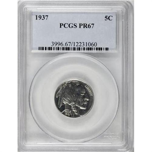 <B>1937 5C PR67 PCGS.</B></I> This nicely struck final-year proof Superb Gem would be called brilliant by some, despite a hint of yellow-gold and ice-blue on each side. The surfaces appear pristine, even when examined at length beneath a loupe. No hairlines, carbon, or other imperfections are detected.<BR><BR><b>Shipping:</b> Coins & Currency (<a target="_blank" href="http://www.heritageauctions.com/common/shipping.php">view shipping information</a>)