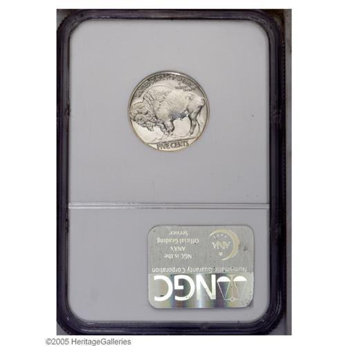 <B>1937<5C> PR68 NGC.</B></I> A glittering, untoned specimen with pinpoint sharpness over the highpoints and a total lack of carbon. The "as struck" appearance of this proof Buffalo nickel is matched by its superlative technical merits. Population: 31 in 68, 0 finer (10/05).<BR><I>From The Hensley Collection.</B></I>
