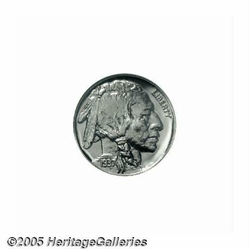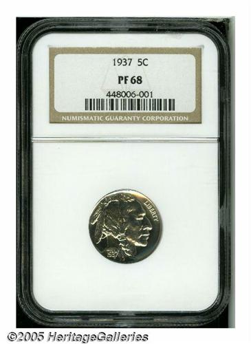<B>1937<5C> PR68 NGC.</B></I> A glittering, untoned specimen with pinpoint sharpness over the highpoints and a total lack of carbon. The "as struck" appearance of this proof Buffalo is matched by its superlative technical merits. Population: 31 in 68, 0 finer (5/05).