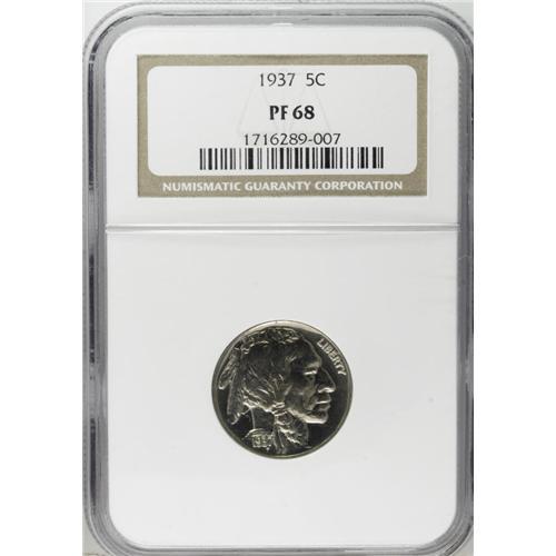 <B>1937 5C PR68 NGC.</B></I> Once proof production started up again in 1936, Buffalo nickels appeared in this format for just two years. The first pieces coined in 1936 had a satin finish, while the balance of that year and all examples of 1937 had the brilliant finish seen here. This piece has remarkable surfaces with deeply mirrored fields and light cameo contrast. Census: 32 in 68, 0 finer (10/06).<BR><BR><b>Shipping:</b> Coin/Currency (<a target="_blank" href="http://www.heritageauctions.com/common/shipping.php">view shipping information</a>)