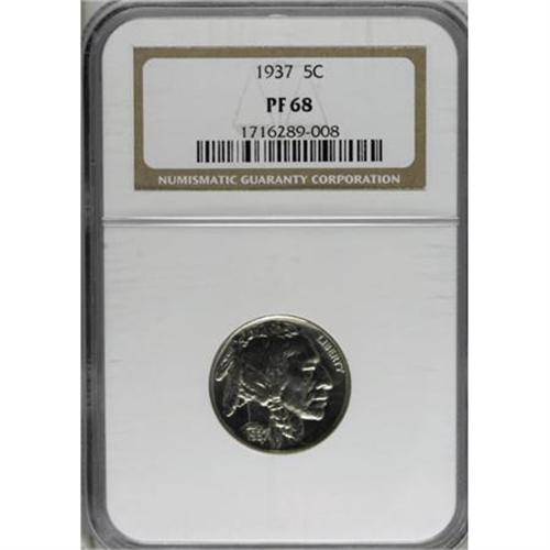 <B>1937 5C PR68 NGC.</B></I> The quicksilver surfaces perhaps show just a smidgen of contrast, more so on the reverse than obverse, with a light overlay. As expected for the grade, the details are needle-sharp, and there are no distractions, even of the most picayune sort. Of the more than 5,700 proofs produced, this is one of the four dozen or so best at both services combined, with none finer (7/07).<BR><BR><b>Shipping:</b> Coins & Currency (<a target="_blank" href="http://www.heritageauctions.com/common/shipping.php">view shipping information</a>\)