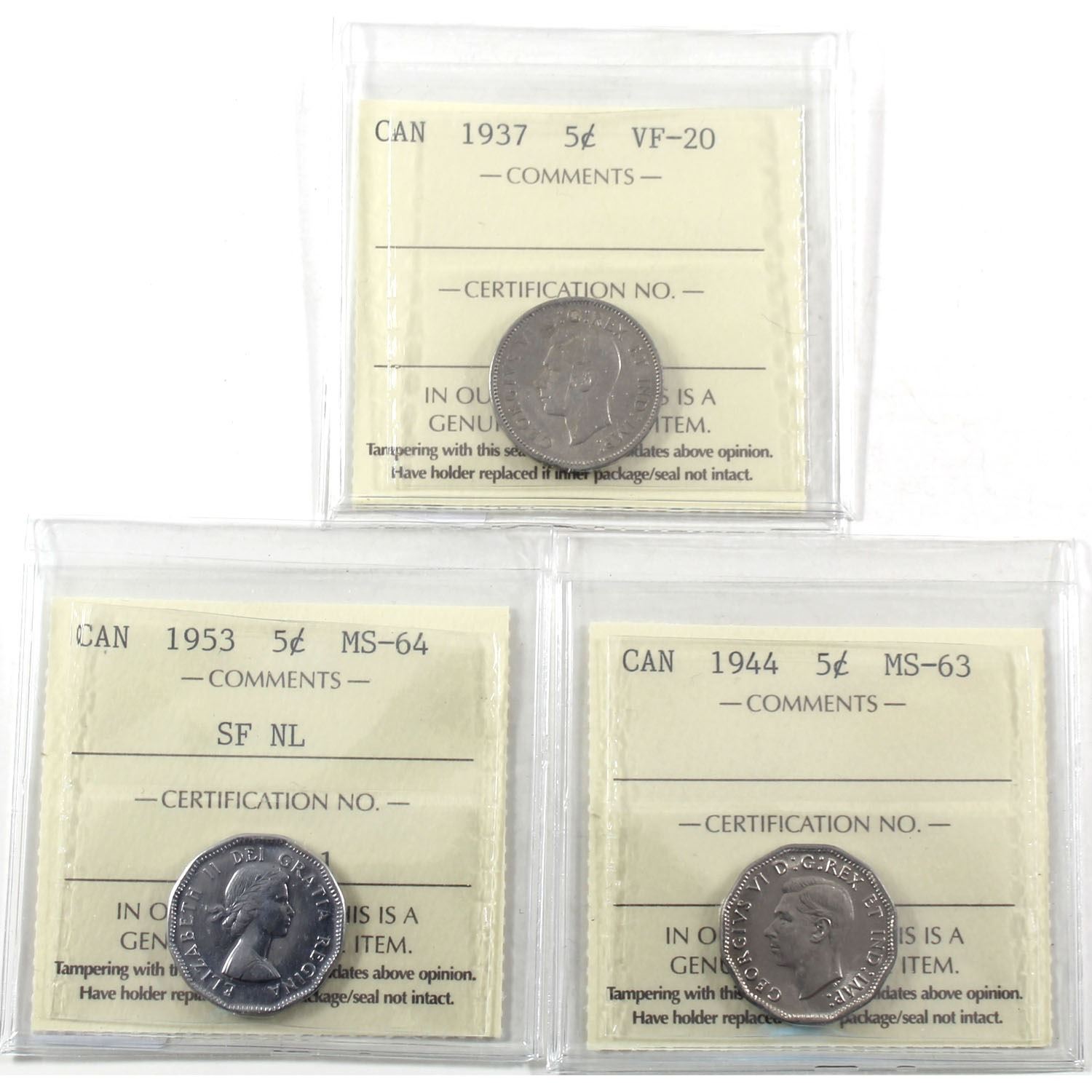 1937 5c VF-20, 1944 5c MS-64 & 1953 SF NL MS-64 ICCS Certified. 3pcs