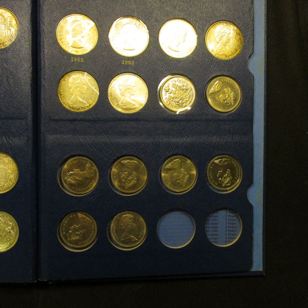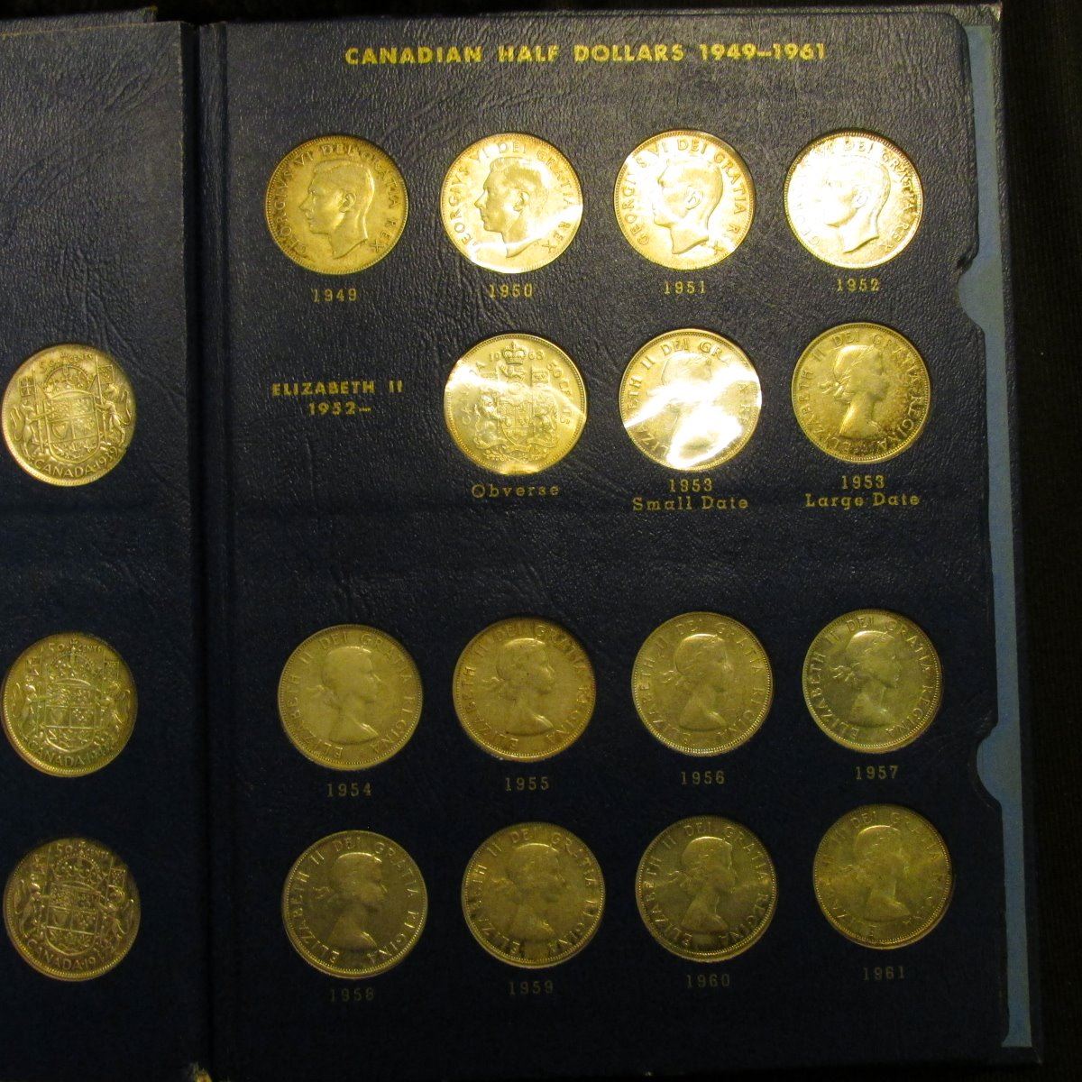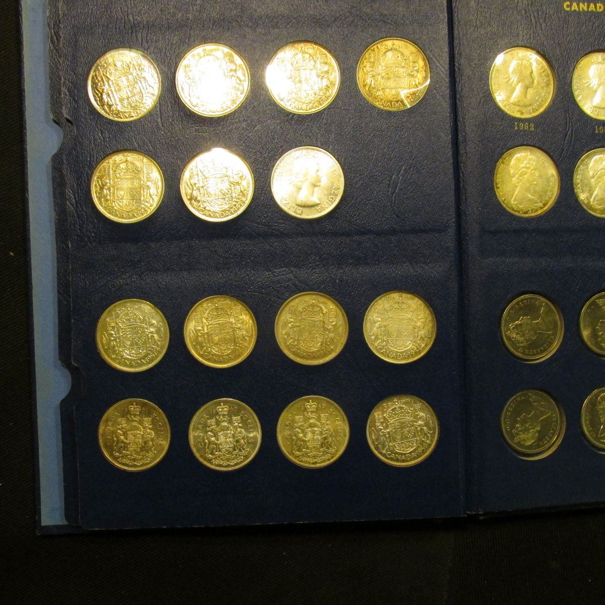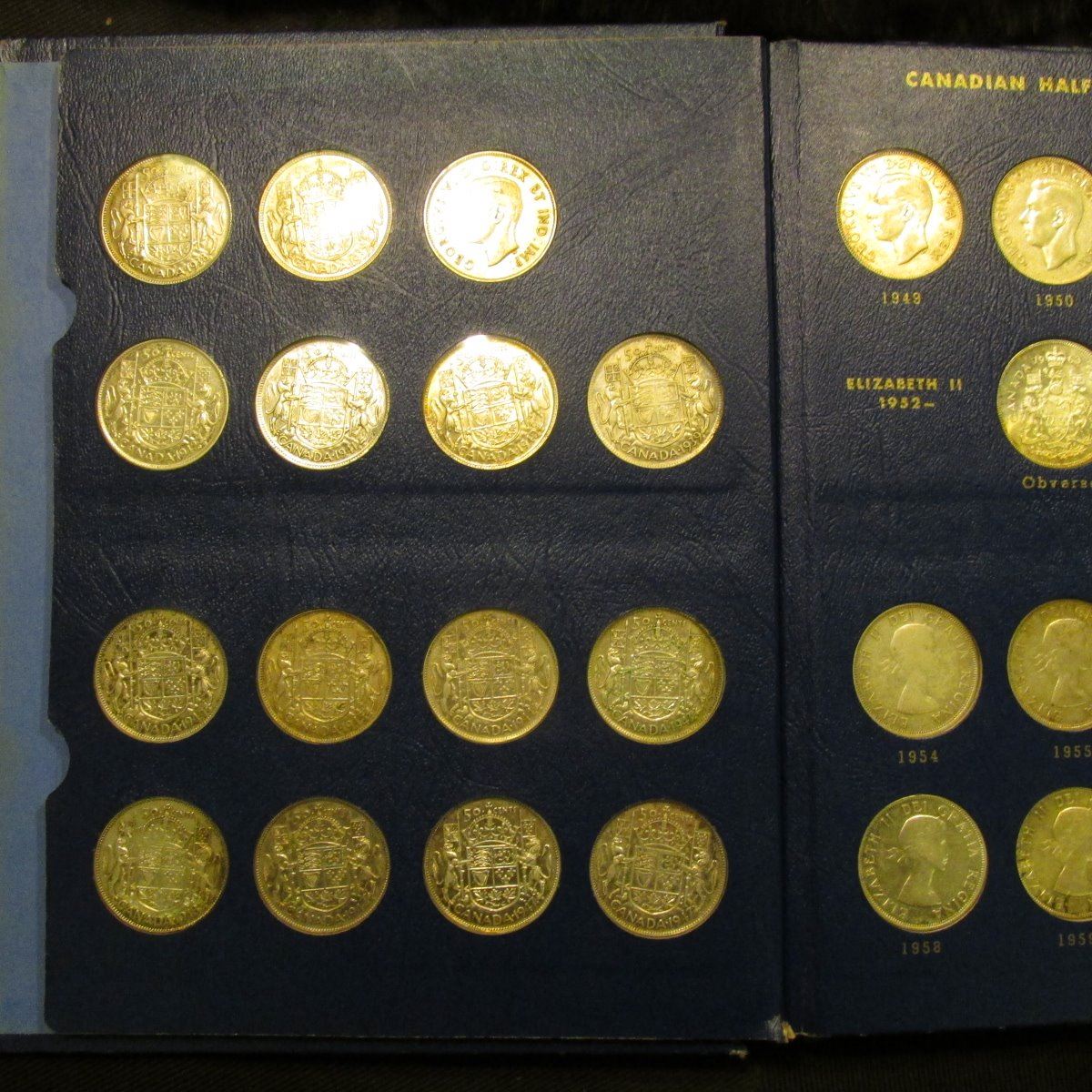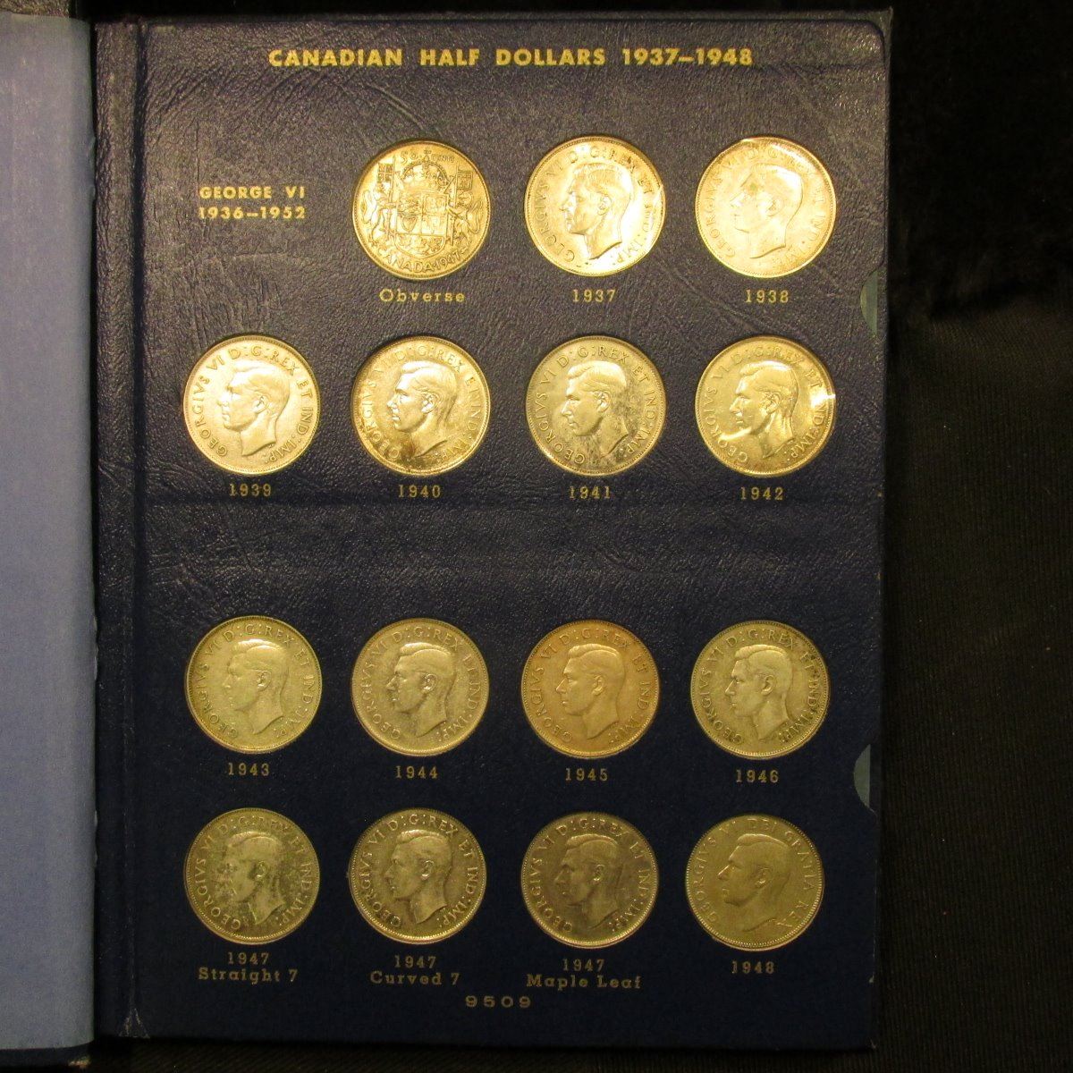 1937-73 Complete collection of Canada Half-Dollars in a Deluxe Whitman album. Includes extra 1947 for the obverse hole, Straight 7, Curved 7, Maple Leaf 7, 1969, & 72. (total of 44 pcs.).