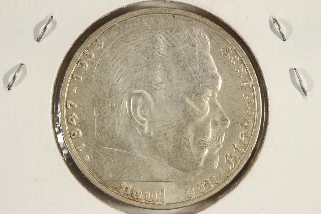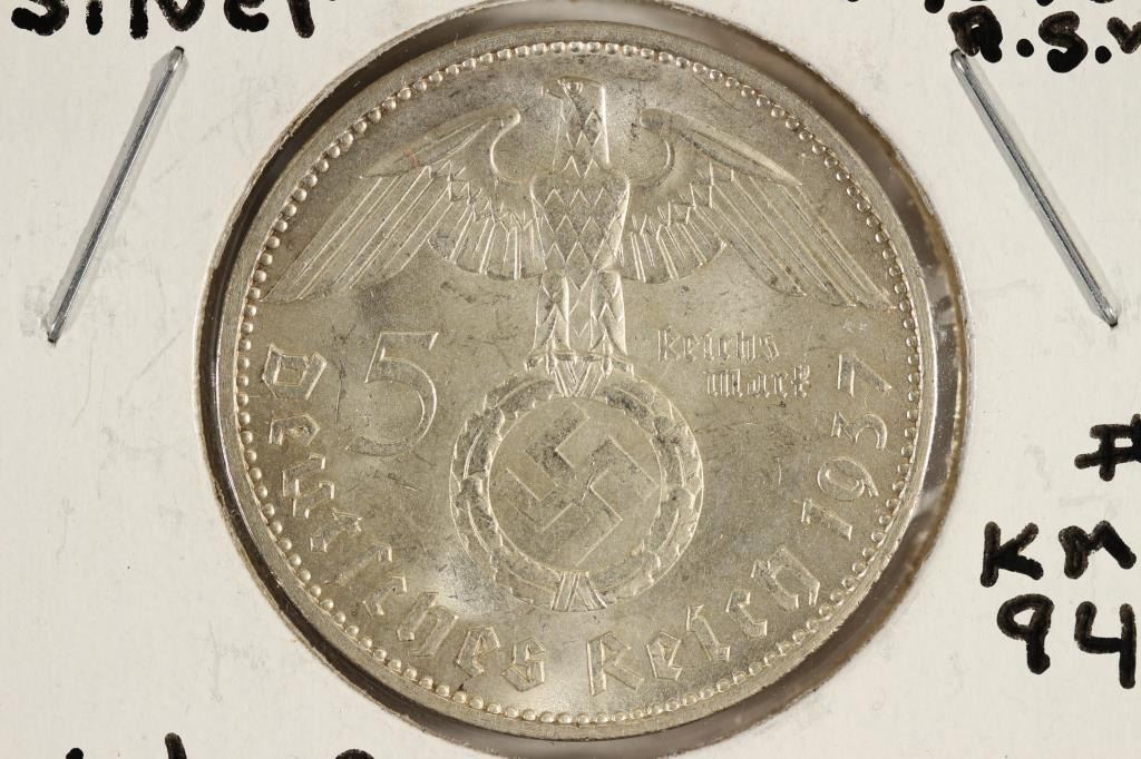 1937-A GERMAN SILVER 5 MARKS WITH SWASTIKA