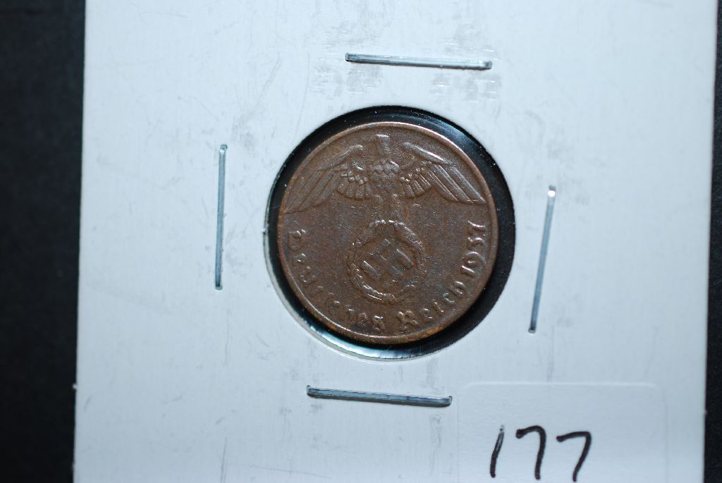 1937-A German 1 Reichspfennig Foreign Coin With Flying Eagle Holding Swatstika; EST. $10-15